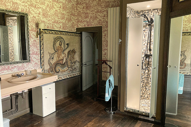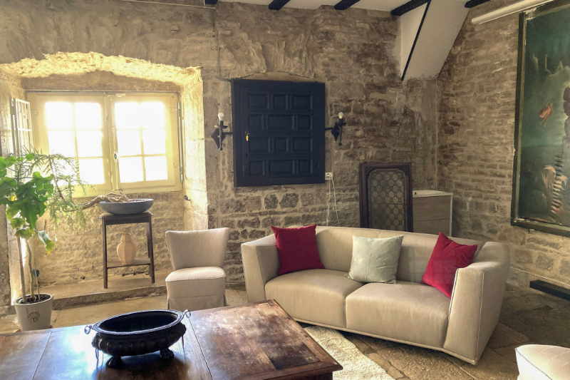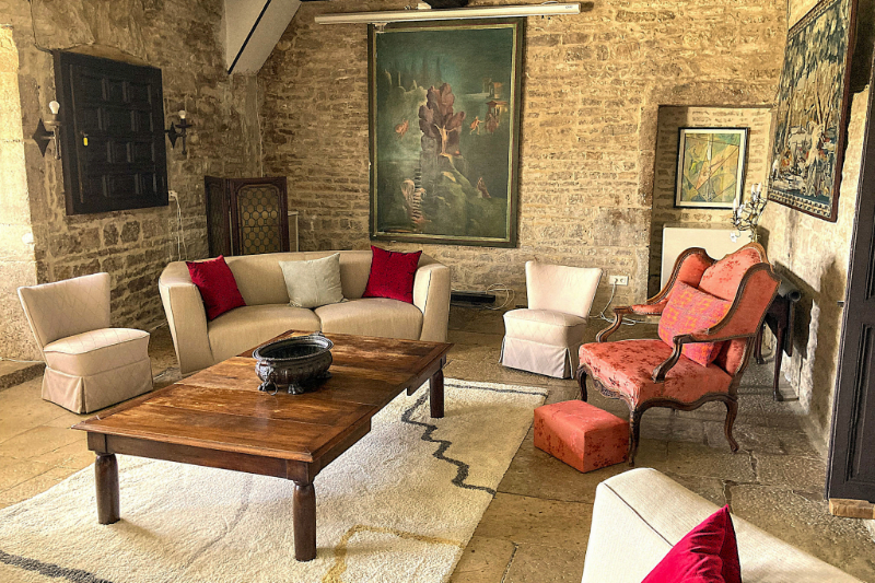Vous pouvez recevoir au rez-de-chaussée du château dans le grand salon et la salle à manger chaleureuse dont les murs sont tendus de toile de Jouy. Vos invités seront charmés par l’authenticité du lieu: meubles d’époque, sols en pierres d’origine, poutres apparentes …