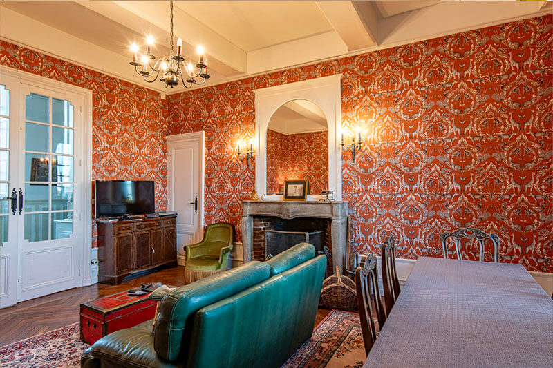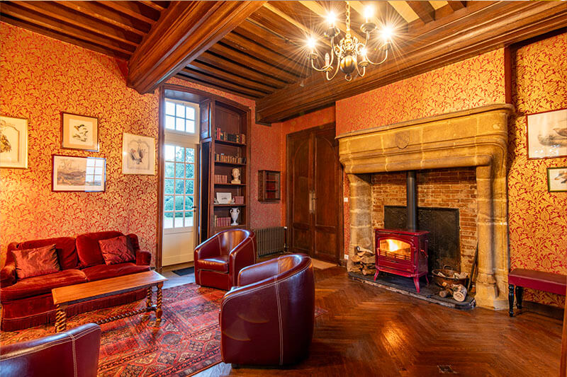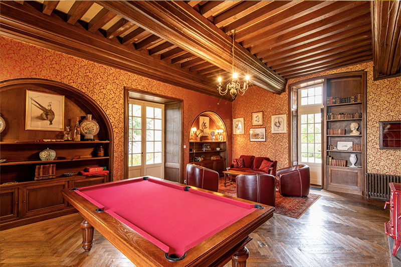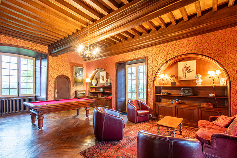 Located at the end of the gallery, the billiard room completes the living spaces with a cozy sitting area and a wood-burning stove — perfect for long, convivial evenings with family or friends.