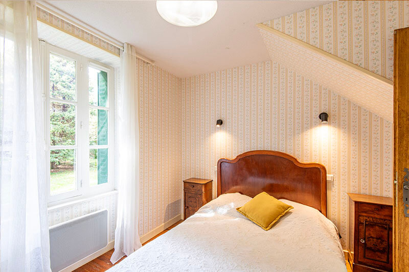 Located on the ground floor, at the end of the wing, this independent bedroom is accessible from outside. It includes a double bed (140 cm) and a shower room with WC.