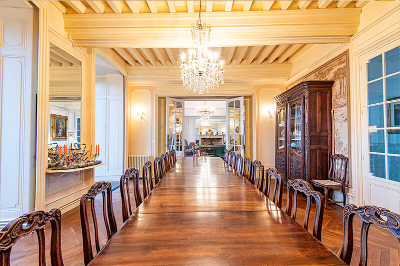 Adjoining the living room, the dining room has a large table that can seat up to 22 guests. With its open views onto the outdoors, it provides a refined setting for festive meals and large family gatherings.